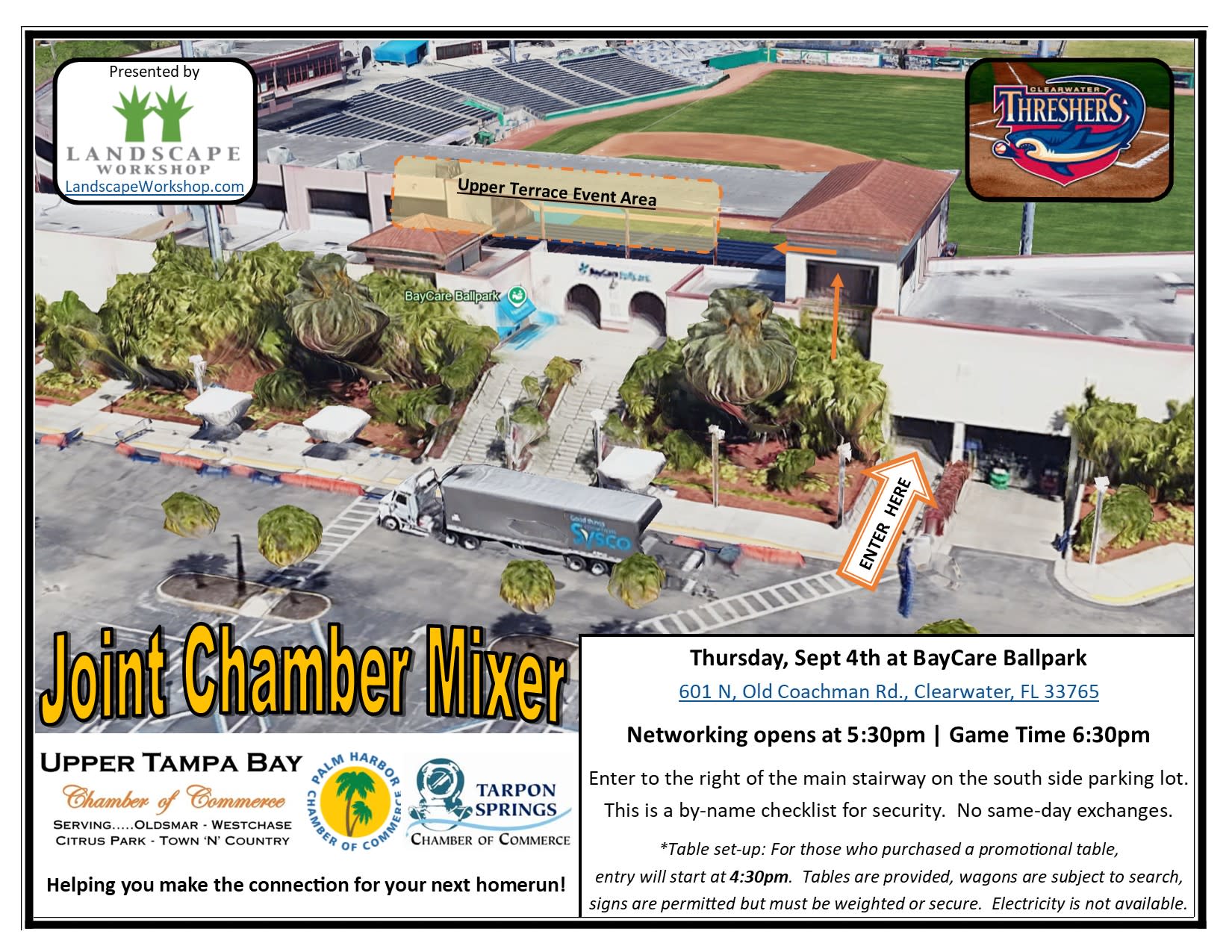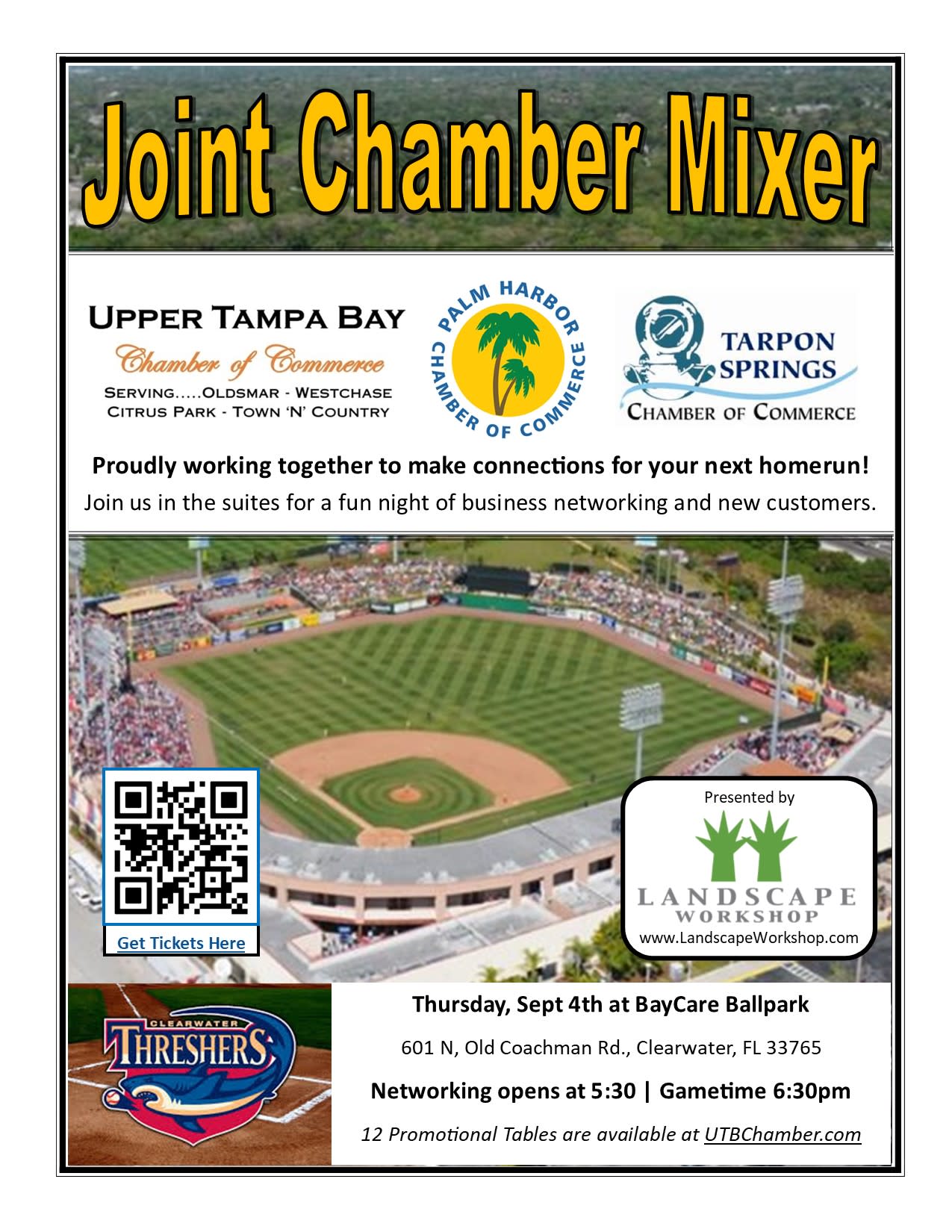 Join us for a fantastic Joint-Chamber Networking event at BayCare Ballpark. The season is winding down, and the Clearwater Threshers and Tampa Tarpons will be going out swinging. Meet us on the Club Level and Party Suites, offering the best view of the action. This includes a flat-screen cable TV with tables and chairs indoors, along with AC and comfortable padded balcony seats outside.
