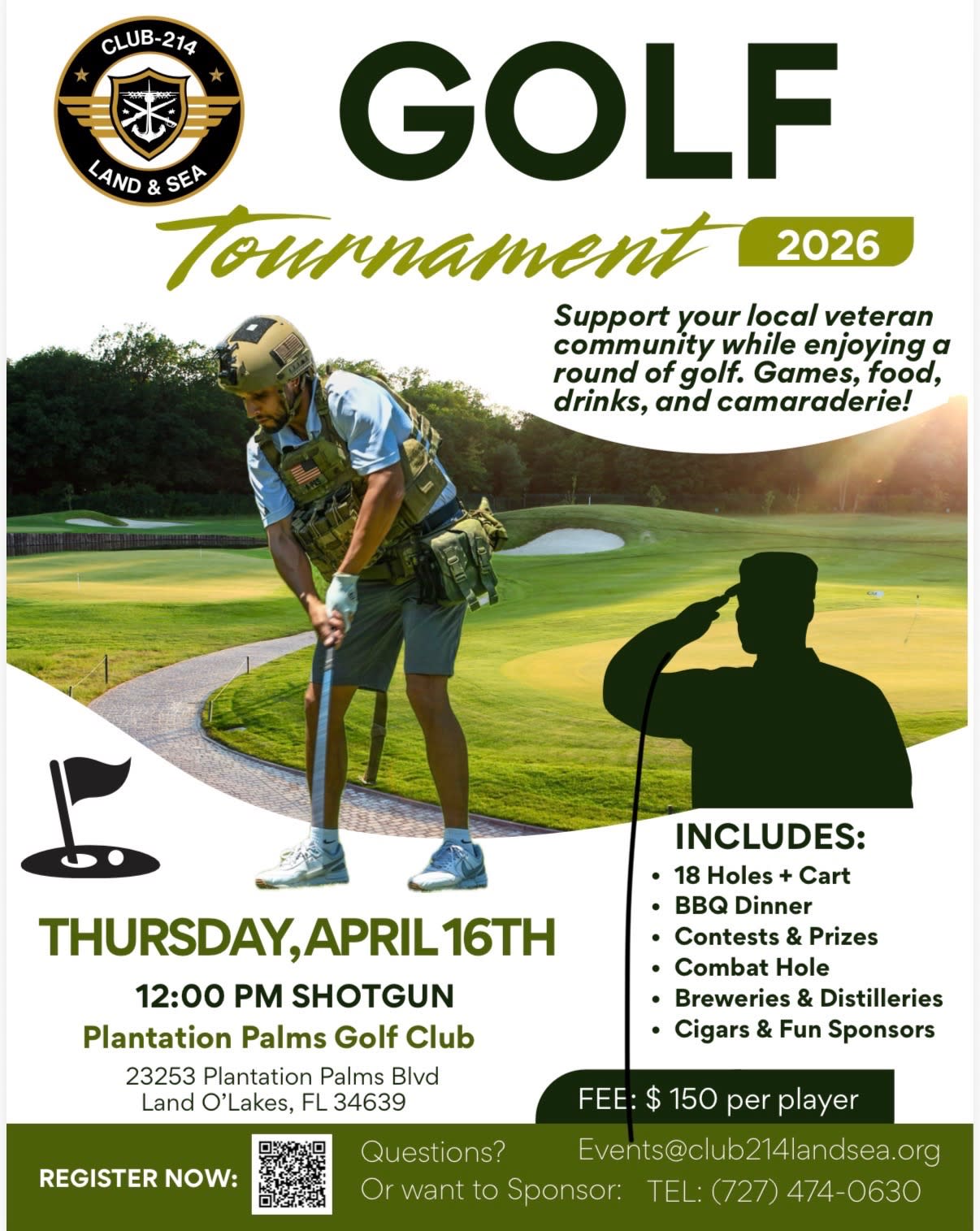 This is our 3rd Annual Club-214 Land & Sea Veterans Golf Tournament at Plantation Palms in Land O’ Lakes — and we sell out every single year.