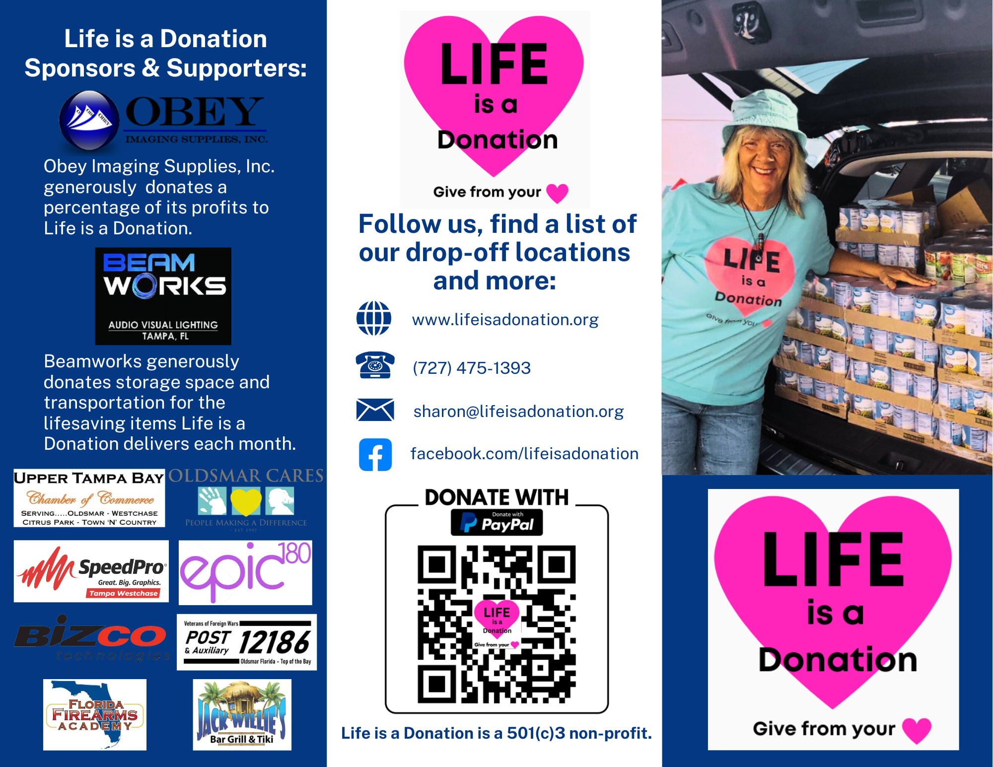 Life Is A Donation is a 501(c)3 non-profit organization that provides life-saving supplies to those in need in Tampa Bay each month.