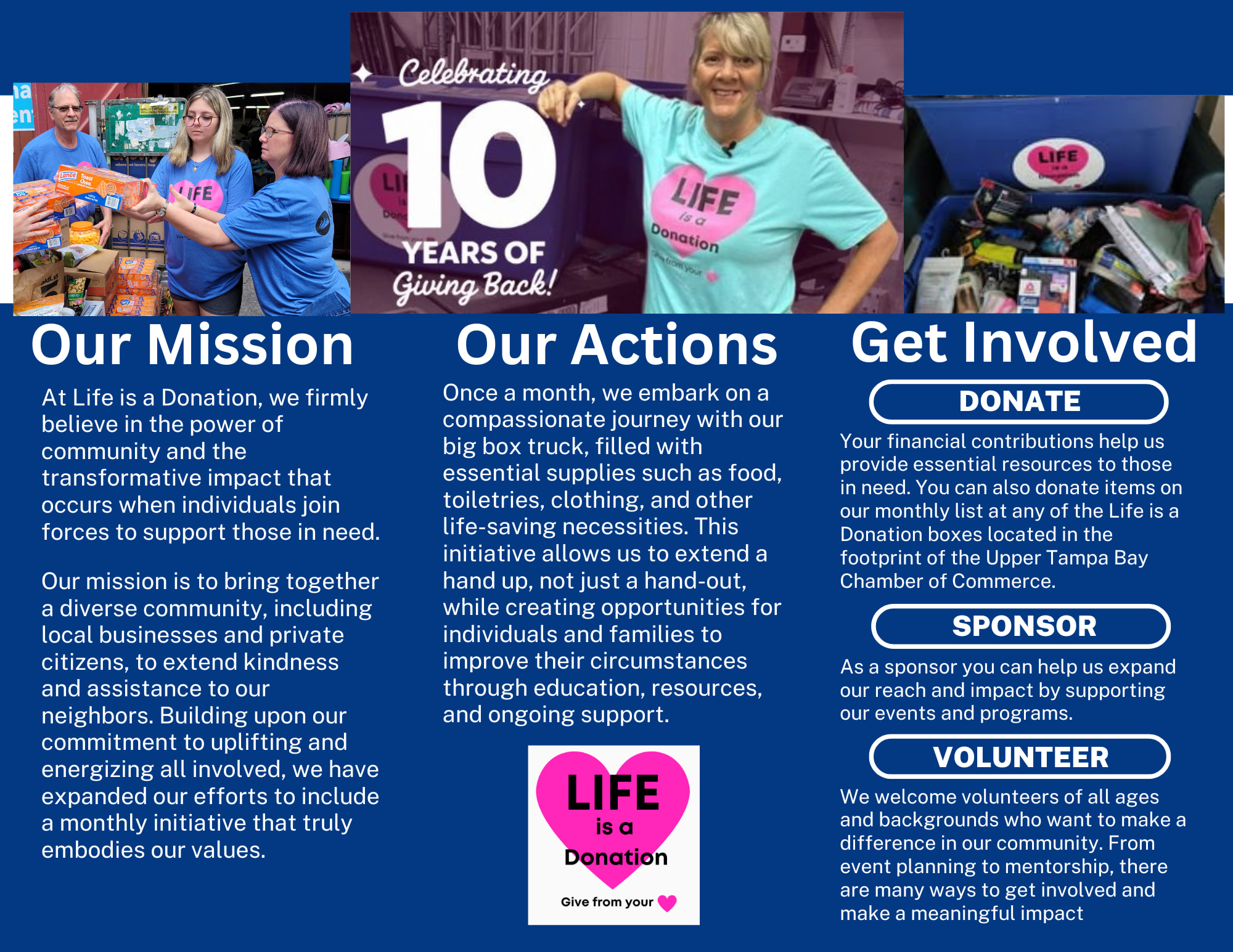 At Life is a Donation Foundation, we firmly believe in the power of community and the transformative impact that occurs when individuals join forces to support those in need. Our mission is to bring together a diverse community, including local businesses and private citizens within the greater Upper Tampa Bay Chamber of Commerce footprint, to extend kindness and assistance to our neighbors. Building upon our commitment to uplifting and energizing all involved, we have expanded our efforts to include a monthly initiative that truly embodies our values.