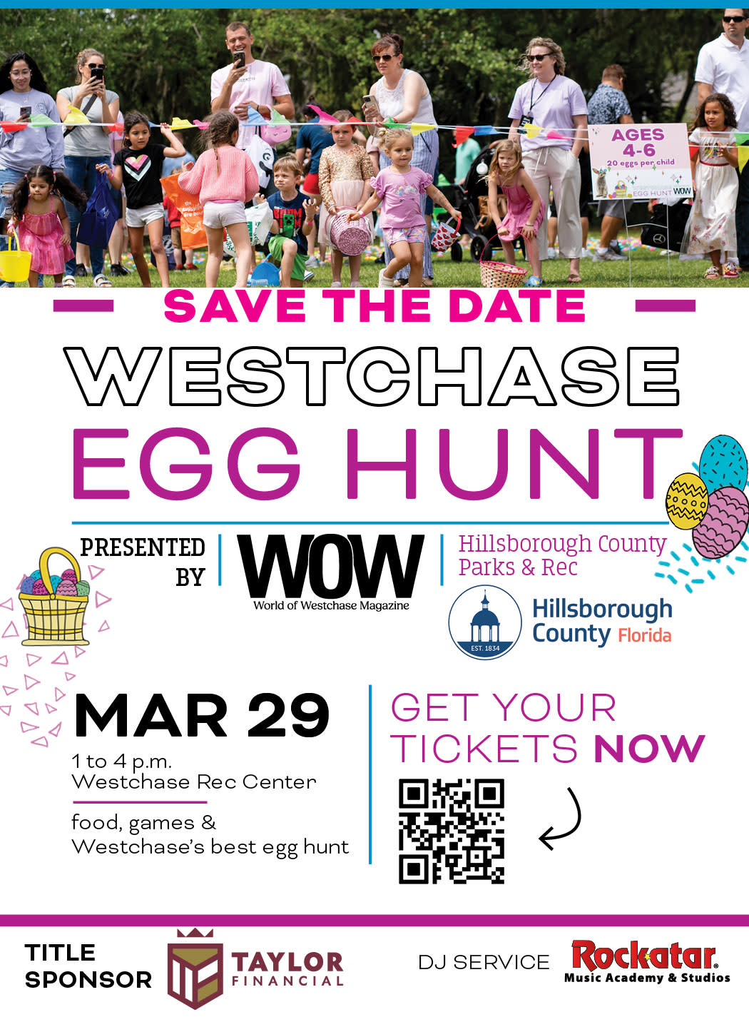 Westchase Egg Hunt on March 29, 2026 at the Westchase Recreation Center (9791 Westchase Drive) from 1-4pm. Sponsorship opportunities and ticket information can be found at https://westchaseegghunt.wixsite.com/westchaseegghunt